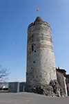 On the east, the round tower was the castle keep. A piece of beam allowed to date the construction at 1232-1233. The top of the tower is transformed in at the beginning of the 14th century. In 1475, the timber frame is destroyed during the siege and the fire of the castle by the Confederates. During a long period, up to 1870, the top of the tower becomes the support of a stork nest.